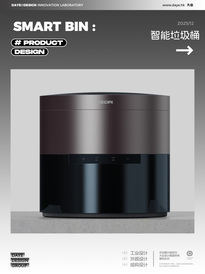 产品采用深棕金属 + 黑的轻奢配色体系,深棕金属质感传递高端、精致的家居属性,适配现代简约、轻奢风等多元空间;黑色区域作为功能交互区,既清晰划分操作模块,又以低饱和色调保持视觉协调,让垃圾桶从实用工具升级为家居装饰。