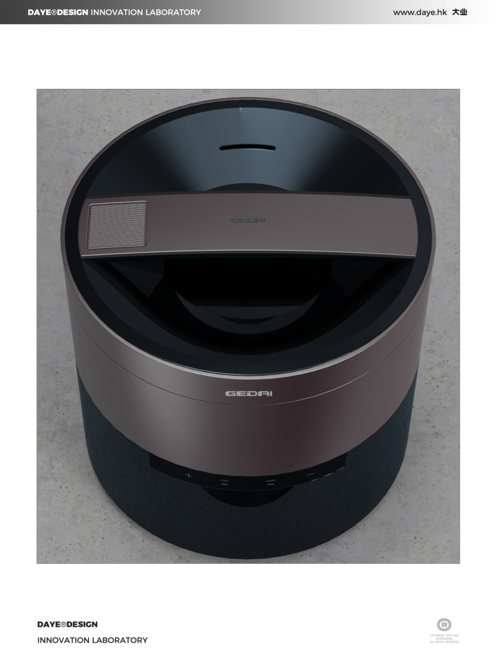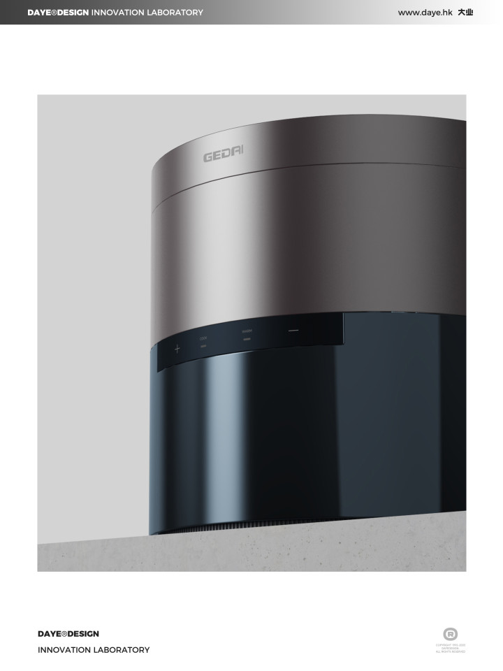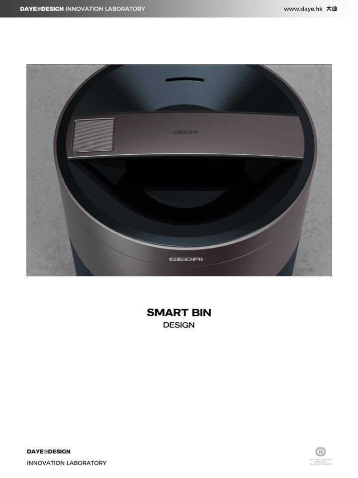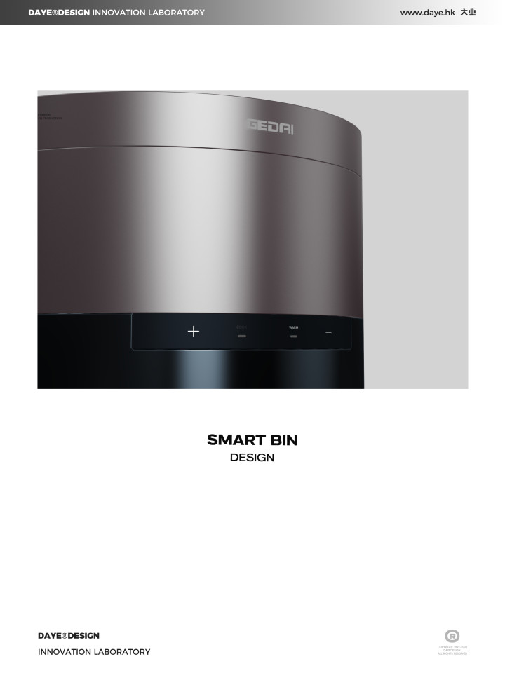 整体遵循圆柱圆润极简造型,无棱角的曲面设计既消解了垃圾桶的生硬感,又让设备能自然融入客厅、厨房等家居场景;上下分层的结构智能感应区 + 储桶区既契合开盖 - 投放的操作流程,又通过材质质感差异强化视觉层次,实现形态美学与空间适配的双向平衡。
