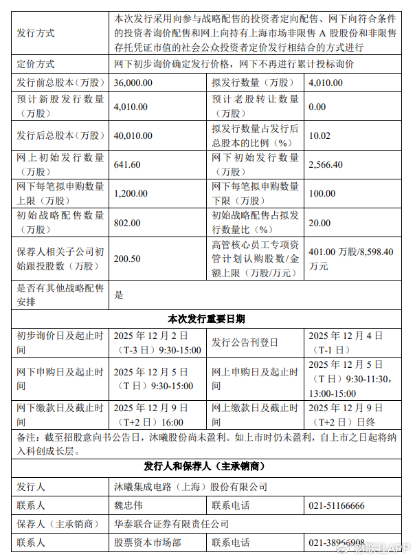 财联社11月26日讯,沐曦股份发布首次公开发行股票并在科创板上市发行安排及初步询价公告,本次发行拟发行数量4010万股,初始战略配售数量802万股,网上申购代码787802,初步询价日2025年12月2日,申购日2025年12月5日。