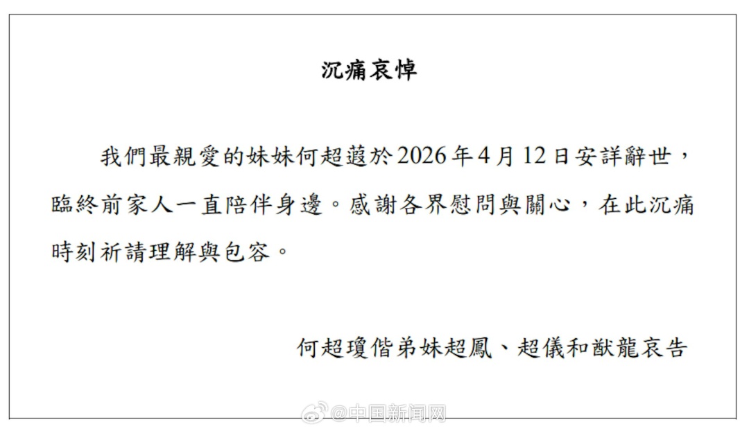 据中国新闻网援引港媒报道,“赌王”何鸿燊女儿、信德集团执行董事何超蕸今日(12日)逝世,临终前家人陪伴在侧。由何超蕸出任执行董事的信德集团,沉痛哀悼何超蕸逝世,并附上家人通告。
